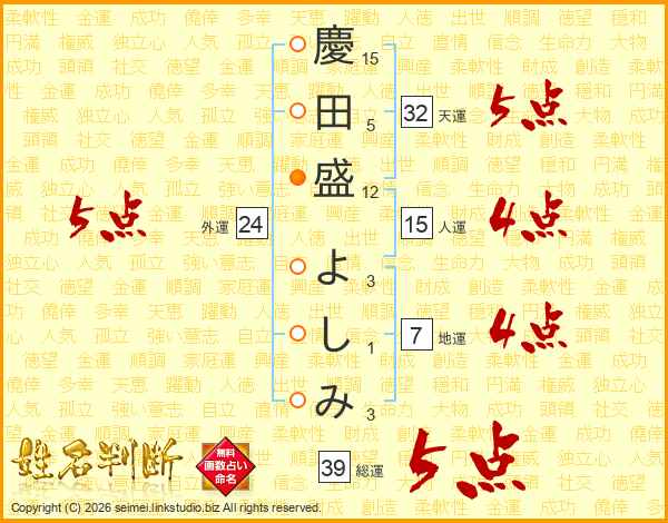 慶田盛よしみさんの総運は39画の5点!