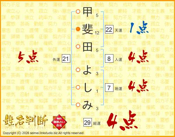 甲(5画)斐(12画)田(5画) よ(3画)し(1画)み(3画)