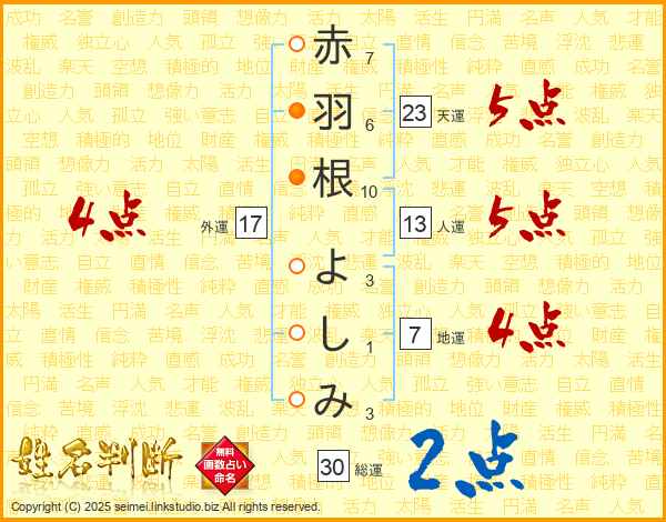 赤(7画)羽(6画)根(10画) よ(3画)し(1画)み(3画)