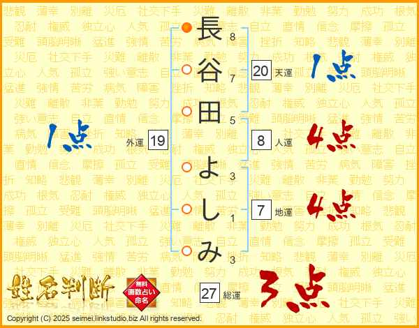 長(8画)谷(7画)田(5画) よ(3画)し(1画)み(3画)