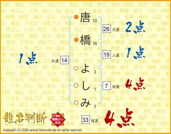 画数の奇数(○陽)と偶数(●陰)の配列で吉凶を占います。どちらかにかたよる名前は大凶名で避ける必要があります。画数の奇数偶数。