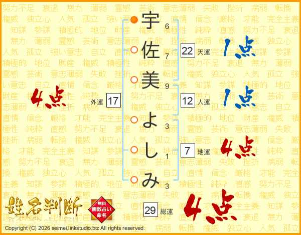 宇佐美よしみさんの総運は29画の4点!