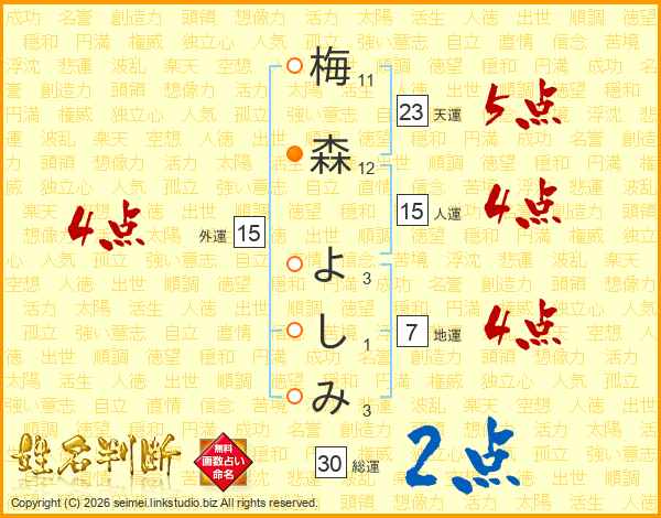 梅(11画)森(12画) よ(3画)し(1画)み(3画)