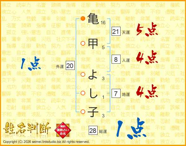 亀(16画)甲(5画) よ(3画)し(1画)子(3画)