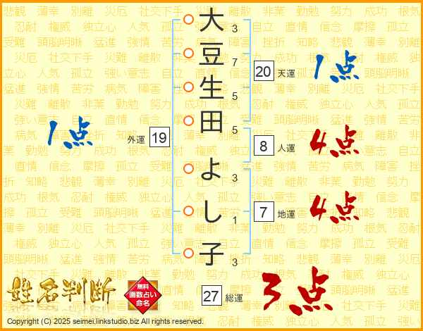 生活面を象徴する運勢です。外部から受ける影響力を表し、結婚運、家庭運や職場、環境への順応性を表します。総運から人運を引いた画数。姓や名が1文字の場合を除く。