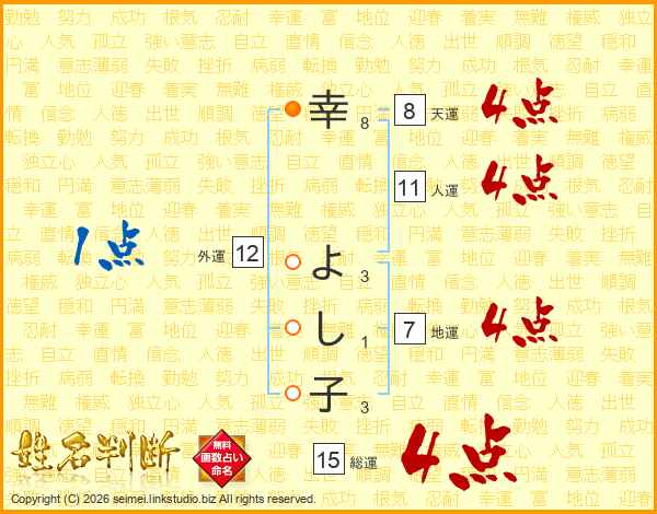 生活面を象徴する運勢です。外部から受ける影響力を表し、結婚運、家庭運や職場、環境への順応性を表します。総運から人運を引いた画数。姓や名が1文字の場合を除く。