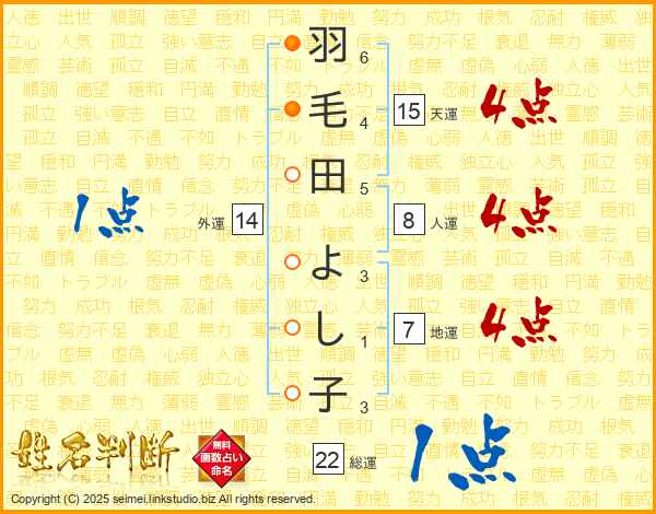 生活面を象徴する運勢です。外部から受ける影響力を表し、結婚運、家庭運や職場、環境への順応性を表します。総運から人運を引いた画数。姓や名が1文字の場合を除く。