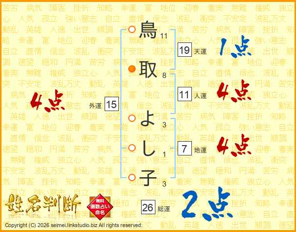 鳥取よし子さんの総運は26画の2点!