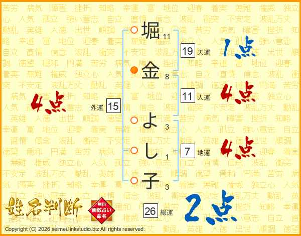 堀(11画)金(8画) よ(3画)し(1画)子(3画)