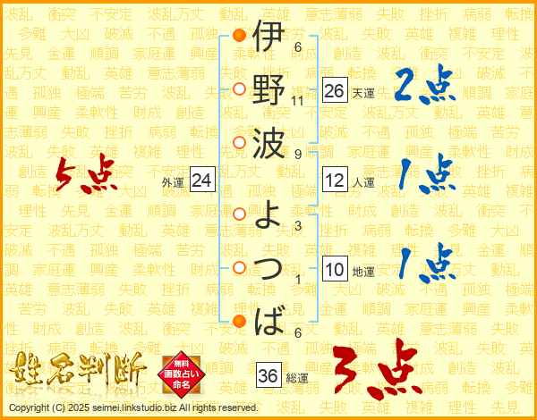 伊(6画)野(11画)波(9画) よ(3画)つ(1画)ば(6画)