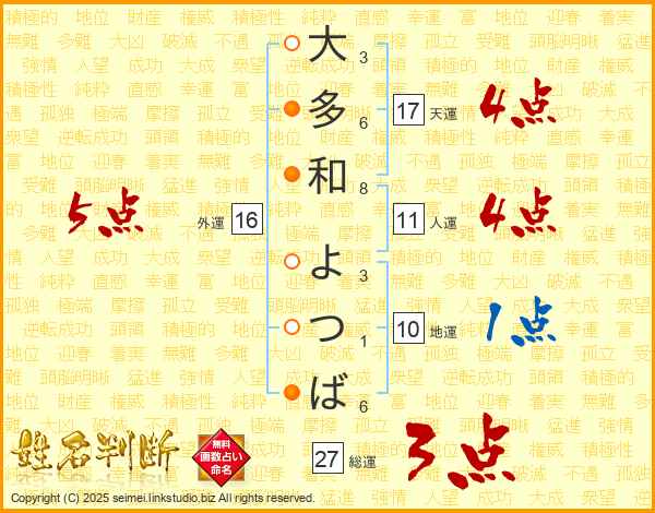 大(3画)多(6画)和(8画) よ(3画)つ(1画)ば(6画)