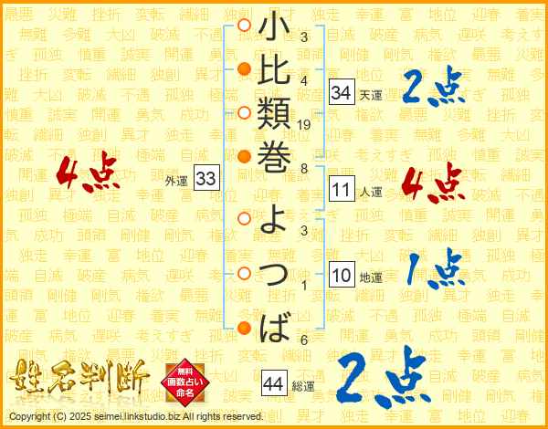 生活面を象徴する運勢です。外部から受ける影響力を表し、結婚運、家庭運や職場、環境への順応性を表します。総運から人運を引いた画数。姓や名が1文字の場合を除く。