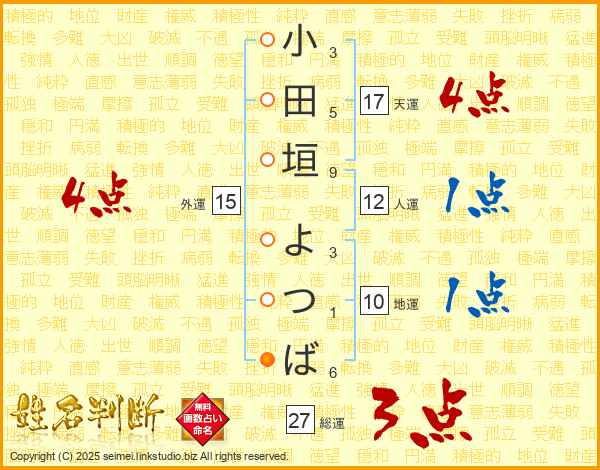 小田垣よつばさんの総運は27画の3点!