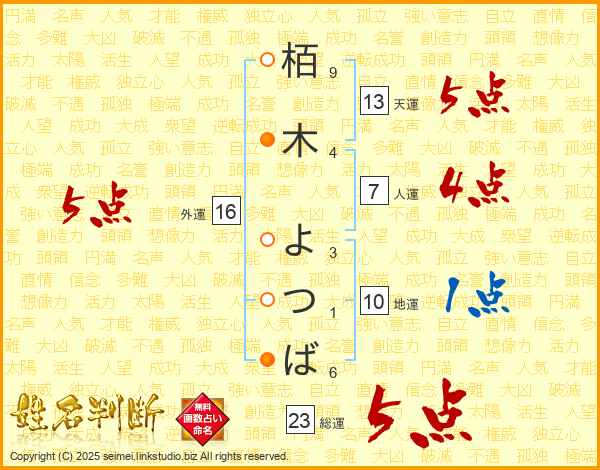 生活面を象徴する運勢です。外部から受ける影響力を表し、結婚運、家庭運や職場、環境への順応性を表します。総運から人運を引いた画数。姓や名が1文字の場合を除く。