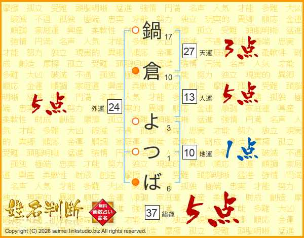 鍋倉よつばさんの総運は37画の5点!