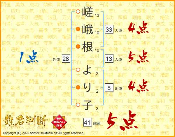嵯峨根より子さんの天運は33画の4点!