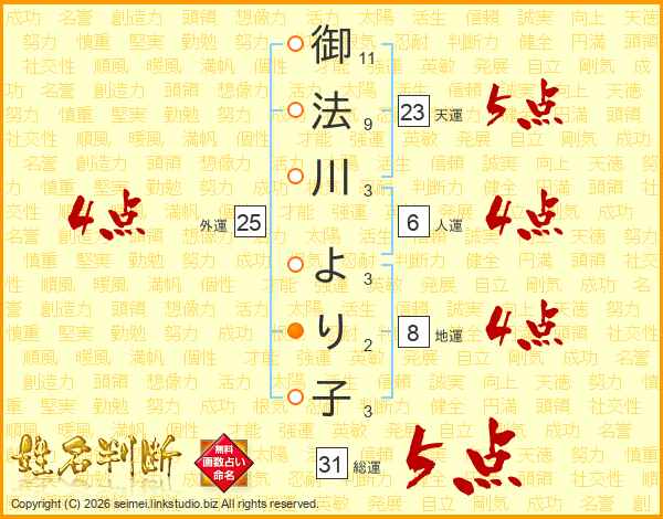 御(11画)法(9画)川(3画) よ(3画)り(2画)子(3画)