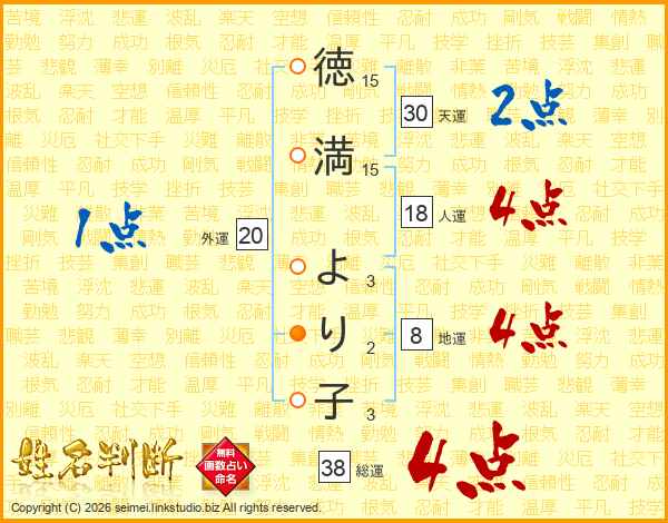 徳(15画)満(15画) よ(3画)り(2画)子(3画)