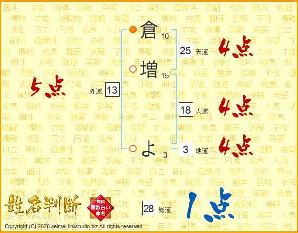 生活面を象徴する運勢です。外部から受ける影響力を表し、結婚運、家庭運や職場、環境への順応性を表します。総運から人運を引いた画数。姓や名が1文字の場合を除く。