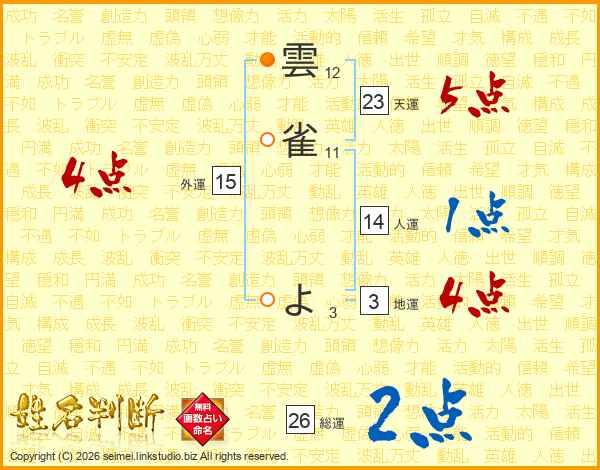 雲雀よさんの総運は26画の2点!