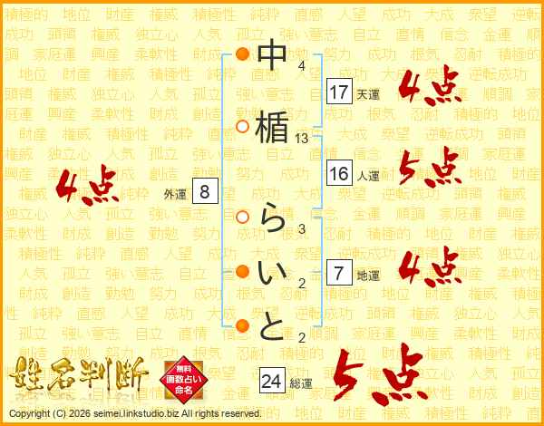 あなたの人生を表す1番重要な運勢です。生涯を通じて影響する総合運となり、主に50歳以降の晩年期に影響を及ぼします。苗字と名前の合計画数。