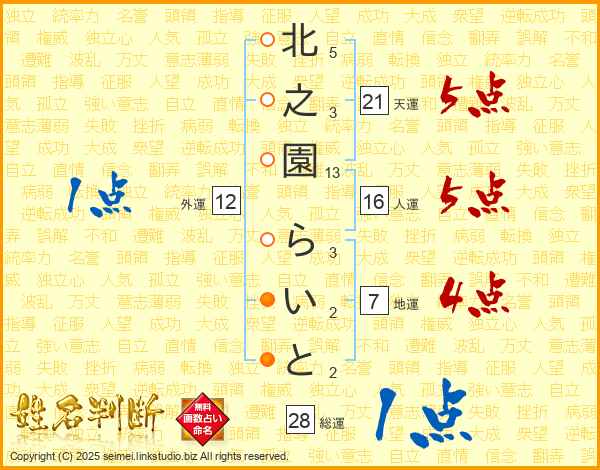 北之園らいとさんの天運は21画の5点!