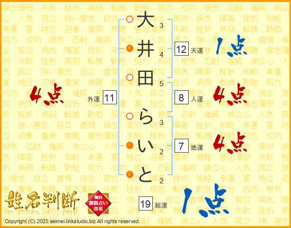 生活面を象徴する運勢です。外部から受ける影響力を表し、結婚運、家庭運や職場、環境への順応性を表します。総運から人運を引いた画数。姓や名が1文字の場合を除く。