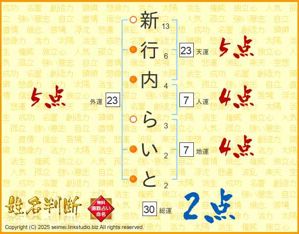 生活面を象徴する運勢です。外部から受ける影響力を表し、結婚運、家庭運や職場、環境への順応性を表します。総運から人運を引いた画数。姓や名が1文字の場合を除く。