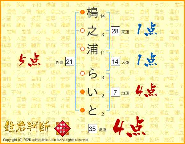生活面を象徴する運勢です。外部から受ける影響力を表し、結婚運、家庭運や職場、環境への順応性を表します。総運から人運を引いた画数。姓や名が1文字の場合を除く。