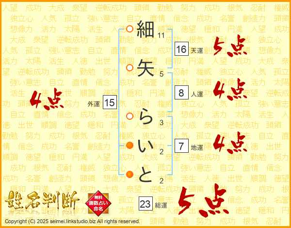 細(11画)矢(5画) ら(3画)い(2画)と(2画)