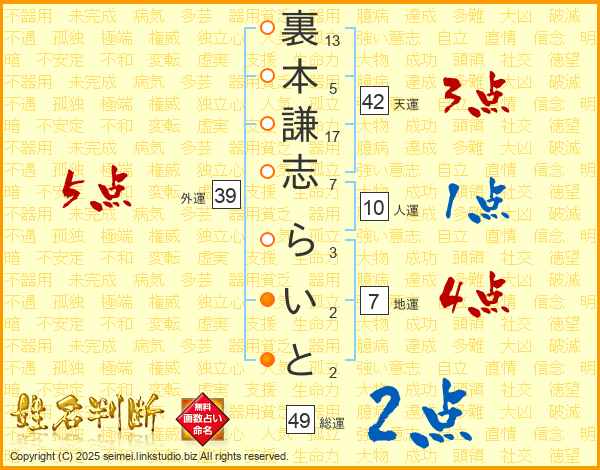 裏本謙志らいとさんの総運は49画の2点!