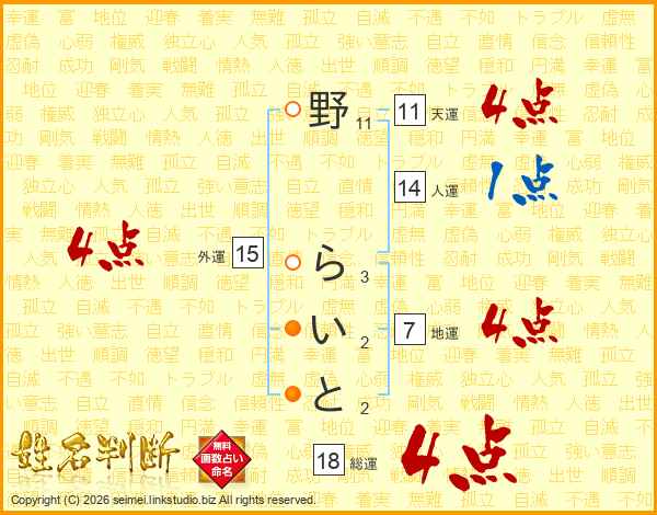 生活面を象徴する運勢です。外部から受ける影響力を表し、結婚運、家庭運や職場、環境への順応性を表します。総運から人運を引いた画数。姓や名が1文字の場合を除く。