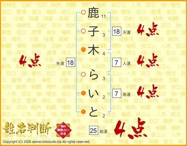 あなたの人生を表す1番重要な運勢です。生涯を通じて影響する総合運となり、主に50歳以降の晩年期に影響を及ぼします。苗字と名前の合計画数。