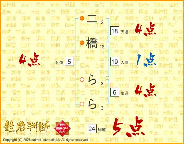 生活面を象徴する運勢です。外部から受ける影響力を表し、結婚運、家庭運や職場、環境への順応性を表します。総運から人運を引いた画数。姓や名が1文字の場合を除く。