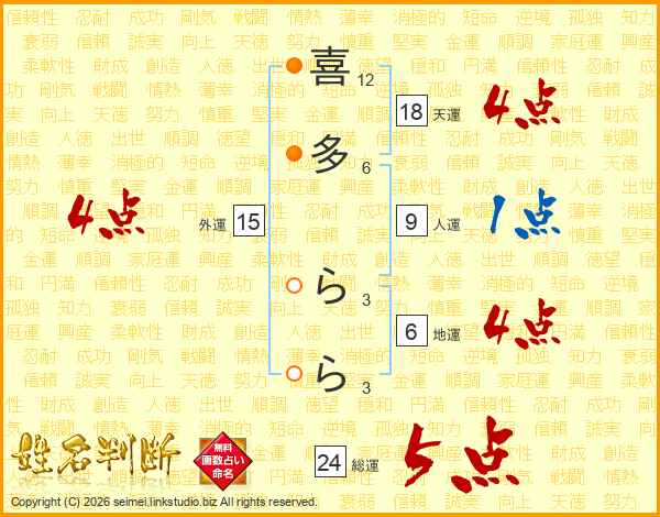 喜(12画)多(6画) ら(3画)ら(3画)