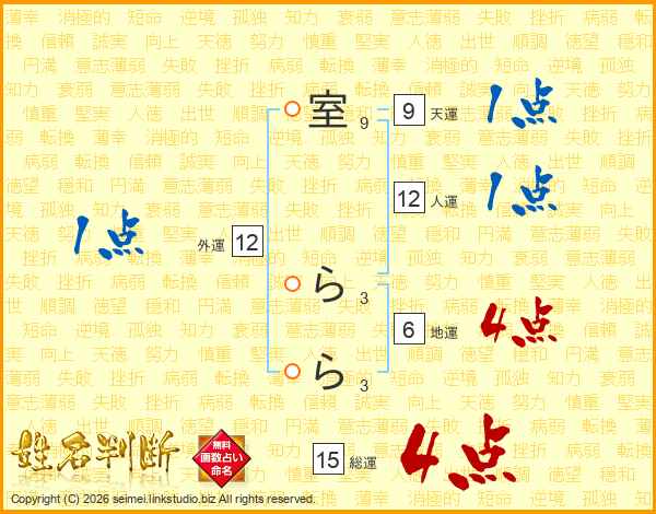 生活面を象徴する運勢です。外部から受ける影響力を表し、結婚運、家庭運や職場、環境への順応性を表します。総運から人運を引いた画数。姓や名が1文字の場合を除く。