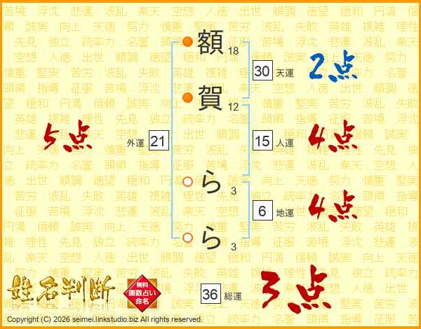 額(18画)賀(12画) ら(3画)ら(3画)
