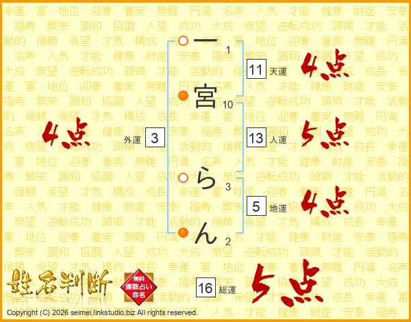 生活面を象徴する運勢です。外部から受ける影響力を表し、結婚運、家庭運や職場、環境への順応性を表します。総運から人運を引いた画数。姓や名が1文字の場合を除く。