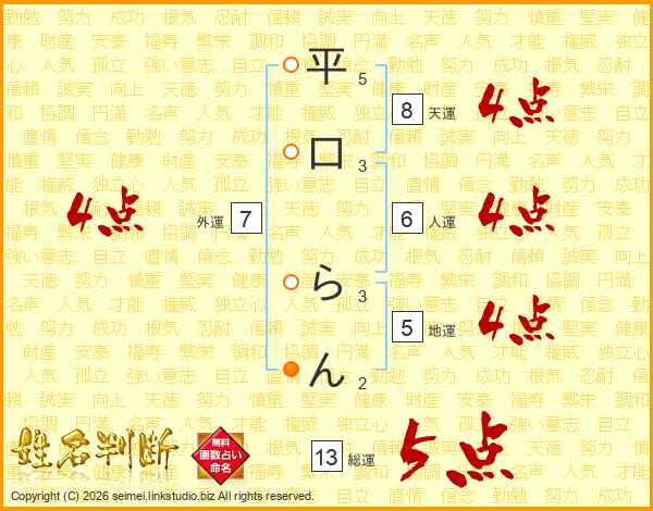 生活面を象徴する運勢です。外部から受ける影響力を表し、結婚運、家庭運や職場、環境への順応性を表します。総運から人運を引いた画数。姓や名が1文字の場合を除く。