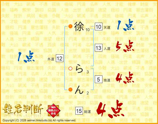 生活面を象徴する運勢です。外部から受ける影響力を表し、結婚運、家庭運や職場、環境への順応性を表します。総運から人運を引いた画数。姓や名が1文字の場合を除く。