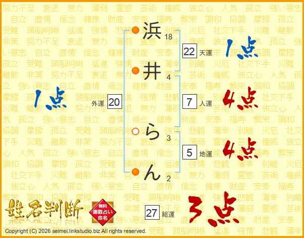 生活面を象徴する運勢です。外部から受ける影響力を表し、結婚運、家庭運や職場、環境への順応性を表します。総運から人運を引いた画数。姓や名が1文字の場合を除く。
