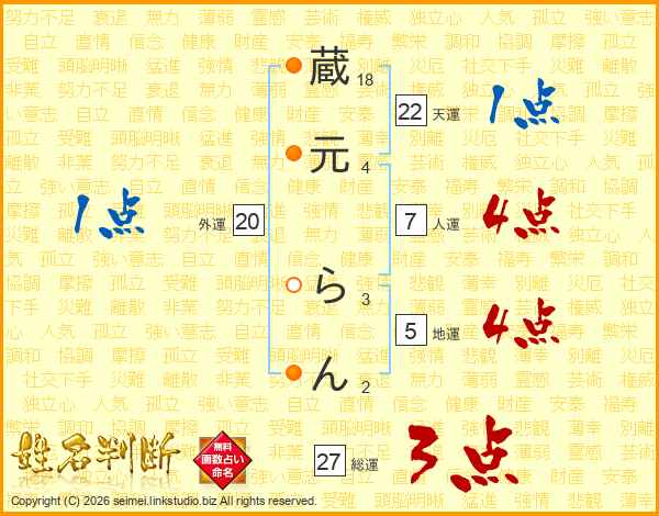 蔵(18画)元(4画) ら(3画)ん(2画)
