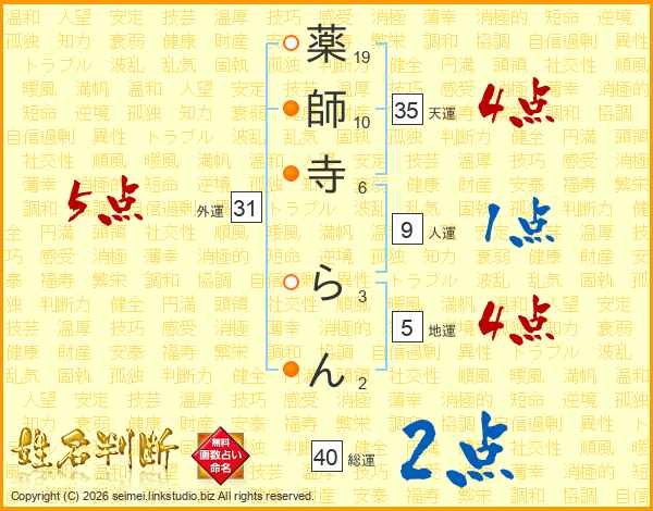 薬(19画)師(10画)寺(6画) ら(3画)ん(2画)