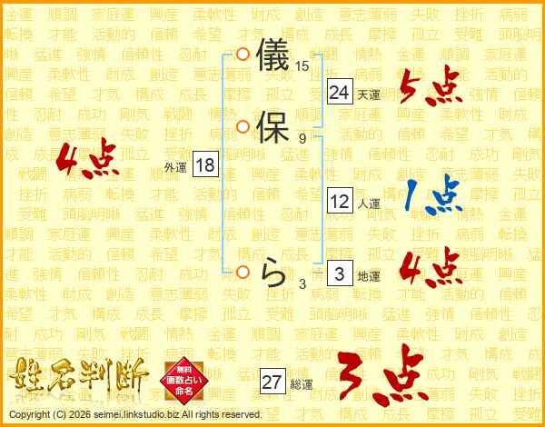 生活面を象徴する運勢です。外部から受ける影響力を表し、結婚運、家庭運や職場、環境への順応性を表します。総運から人運を引いた画数。姓や名が1文字の場合を除く。