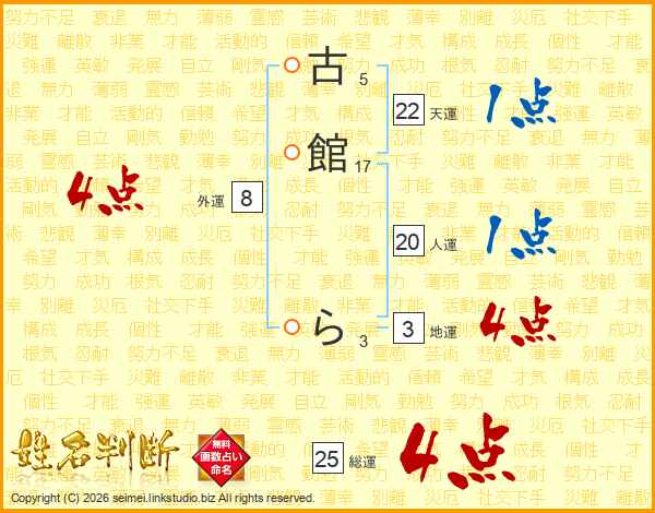 生活面を象徴する運勢です。外部から受ける影響力を表し、結婚運、家庭運や職場、環境への順応性を表します。総運から人運を引いた画数。姓や名が1文字の場合を除く。