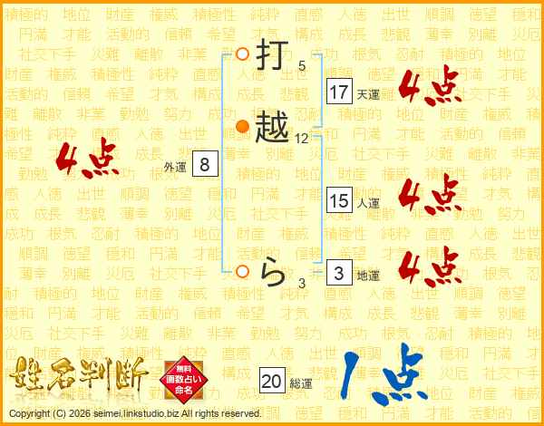 生活面を象徴する運勢です。外部から受ける影響力を表し、結婚運、家庭運や職場、環境への順応性を表します。総運から人運を引いた画数。姓や名が1文字の場合を除く。