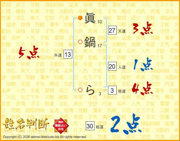 眞鍋らさんの天運は27画の3点!