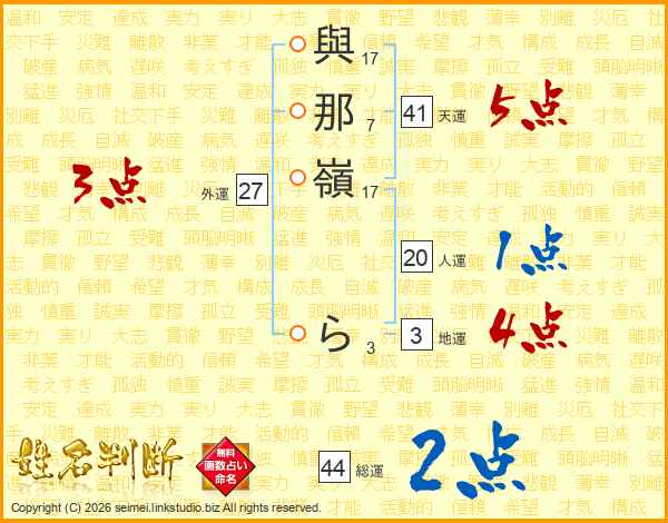 生活面を象徴する運勢です。外部から受ける影響力を表し、結婚運、家庭運や職場、環境への順応性を表します。総運から人運を引いた画数。姓や名が1文字の場合を除く。