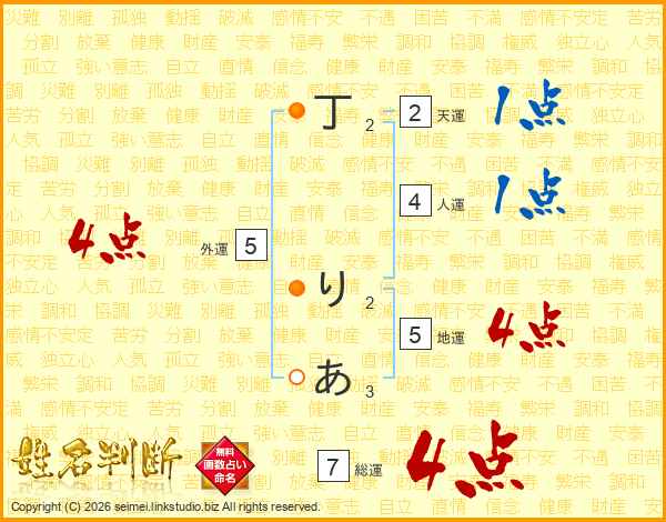 生活面を象徴する運勢です。外部から受ける影響力を表し、結婚運、家庭運や職場、環境への順応性を表します。総運から人運を引いた画数。姓や名が1文字の場合を除く。