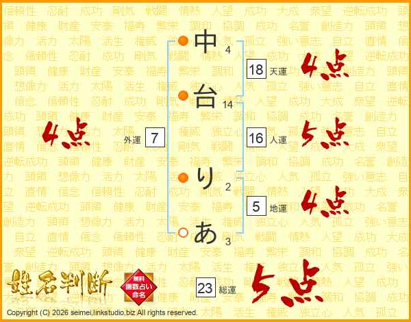 生活面を象徴する運勢です。外部から受ける影響力を表し、結婚運、家庭運や職場、環境への順応性を表します。総運から人運を引いた画数。姓や名が1文字の場合を除く。